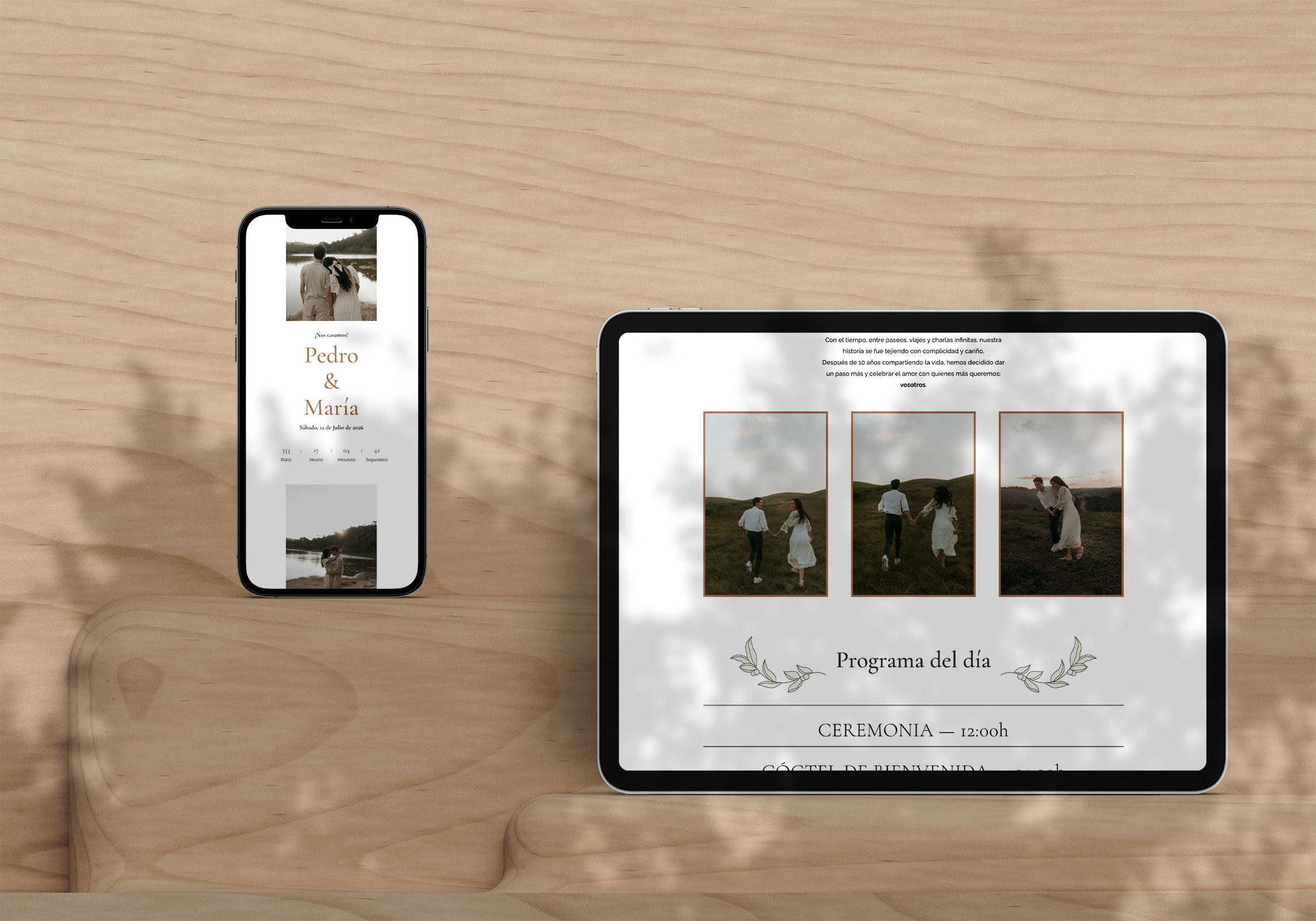 También diseñamos papelería de boda a medida: invitaciones físicas, seating plan, minutas, carteles y otros elementos gráficos que unifican la estética de tu celebración desde el primer detalle.